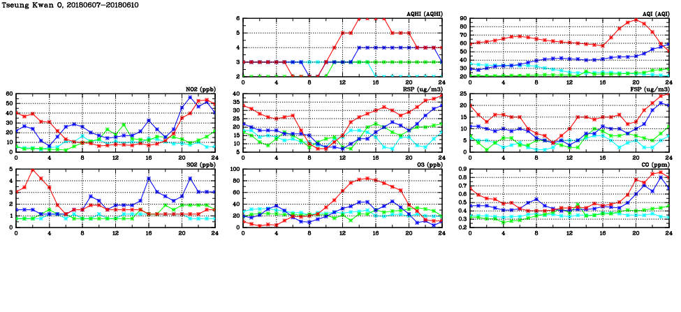 | Air Quality Data Time Series in Tseung Kwan O (2018/06/10) | ( Line colors: Day -3 Day -2 Day -1 Current day ) | 2D Map Current AQHI |