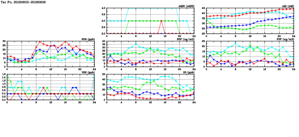 | Air Quality Data Time Series in Tai Po (2018/06/06) | ( Line colors: Day -3 Day -2 Day -1 Current day ) | 2D Map Current AQHI |
