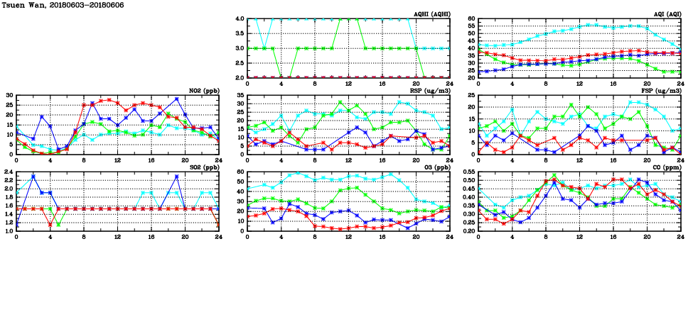 | Air Quality Data Time Series in Tsuen Wan (2018/06/06) | ( Line colors: Day -3 Day -2 Day -1 Current day ) | 2D Map Current AQHI |
