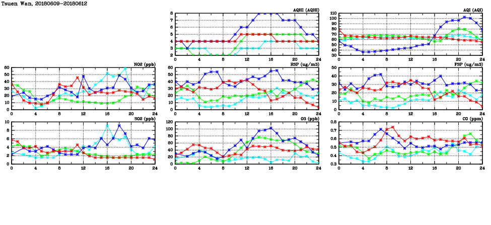 | Air Quality Data Time Series in Tsuen Wan (2018/06/12) | ( Line colors: Day -3 Day -2 Day -1 Current day ) | 2D Map Current AQHI |