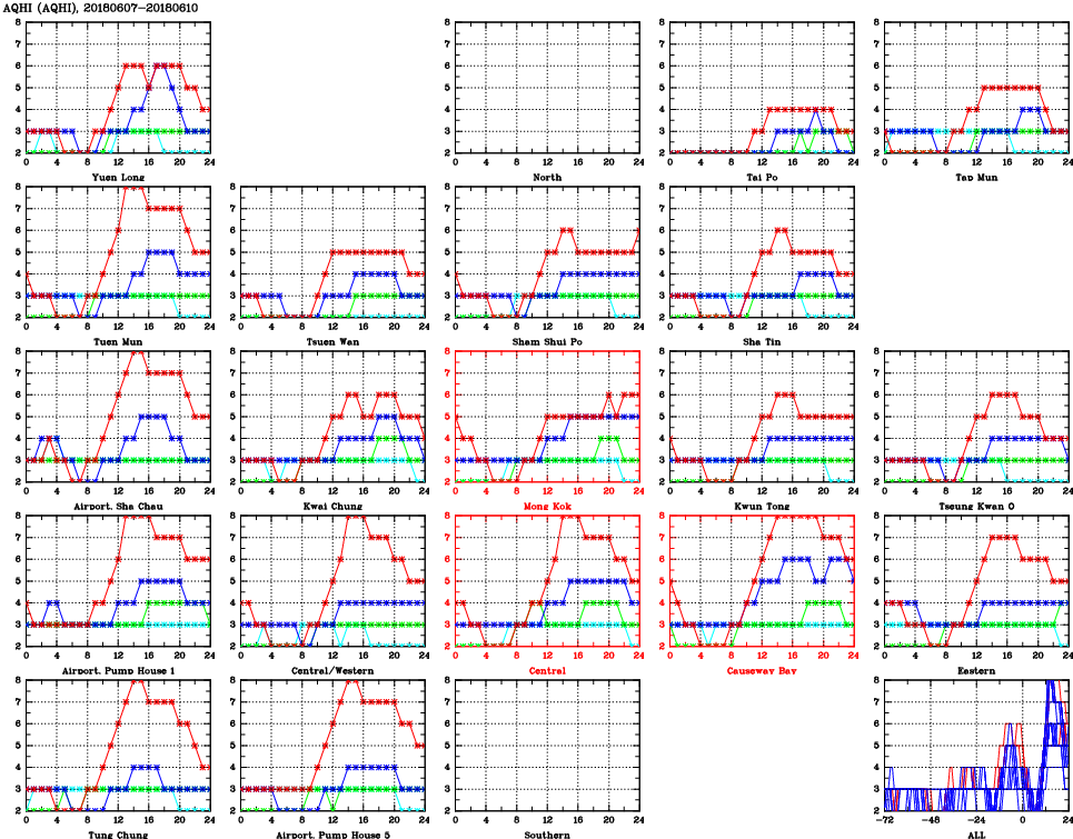 | Air Quality Data Time Series for AQHI (2018/06/10) | ( Line colors: Day -3 Day -2 Day -1 Current day ) | 2D Map Current AQHI |