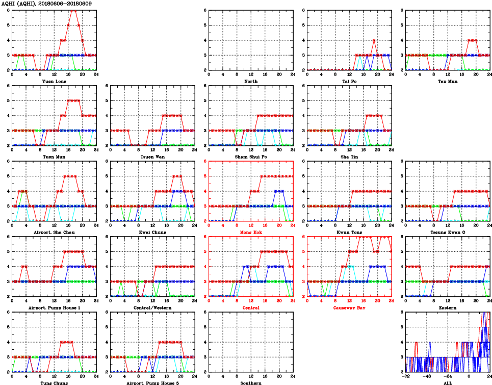 | Air Quality Data Time Series for AQHI (2018/06/09) | ( Line colors: Day -3 Day -2 Day -1 Current day ) | 2D Map Current AQHI |