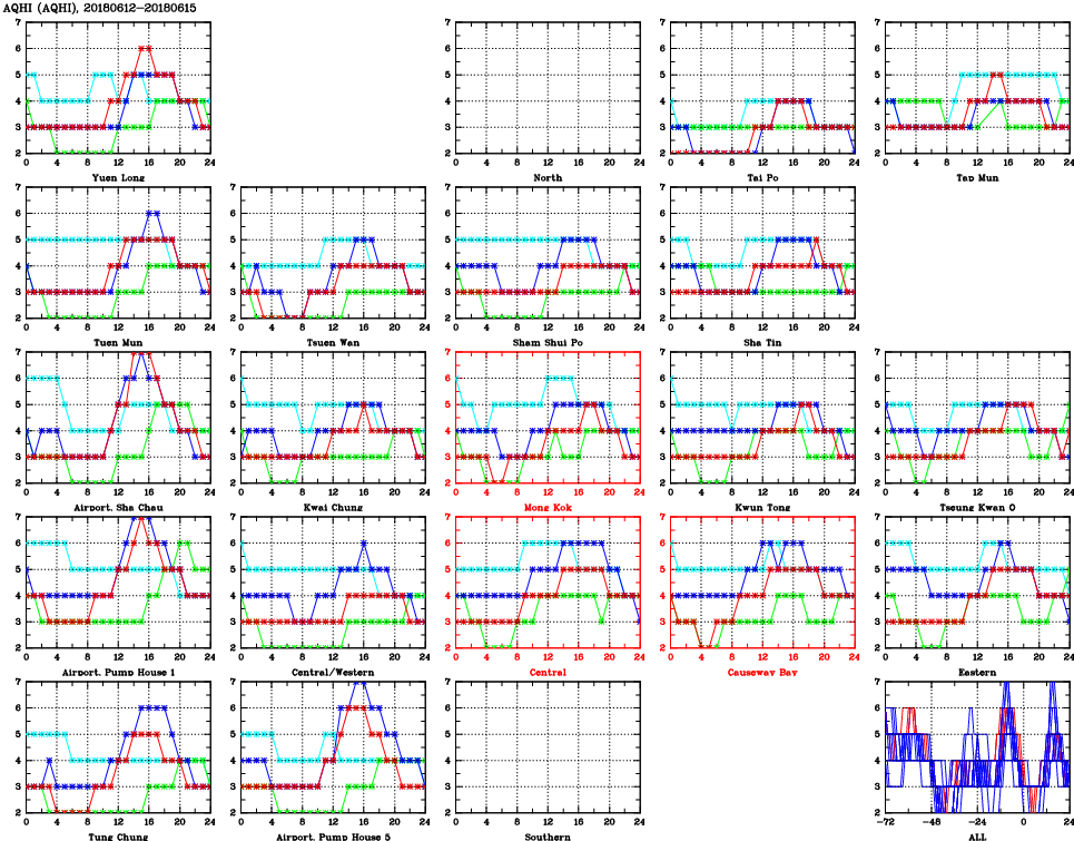 | Air Quality Data Time Series for AQHI (2018/06/15) | ( Line colors: Day -3 Day -2 Day -1 Current day ) | 2D Map Current AQHI |