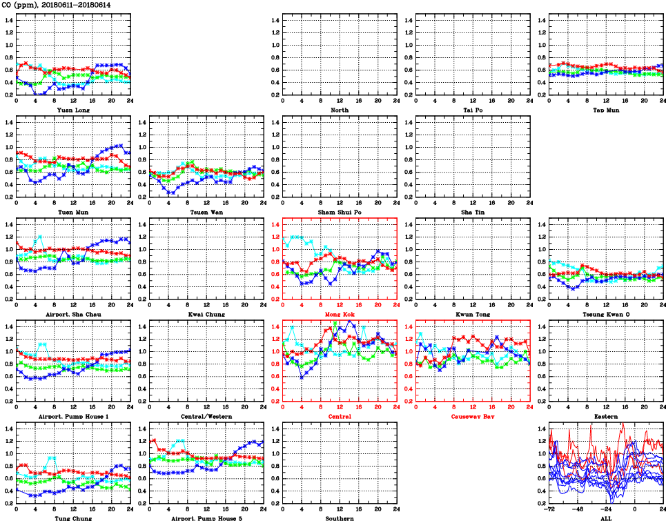 | Air Quality Data Time Series for CO (2018/06/14) | ( Line colors: Day -3 Day -2 Day -1 Current day ) | 2D Map Current AQHI |