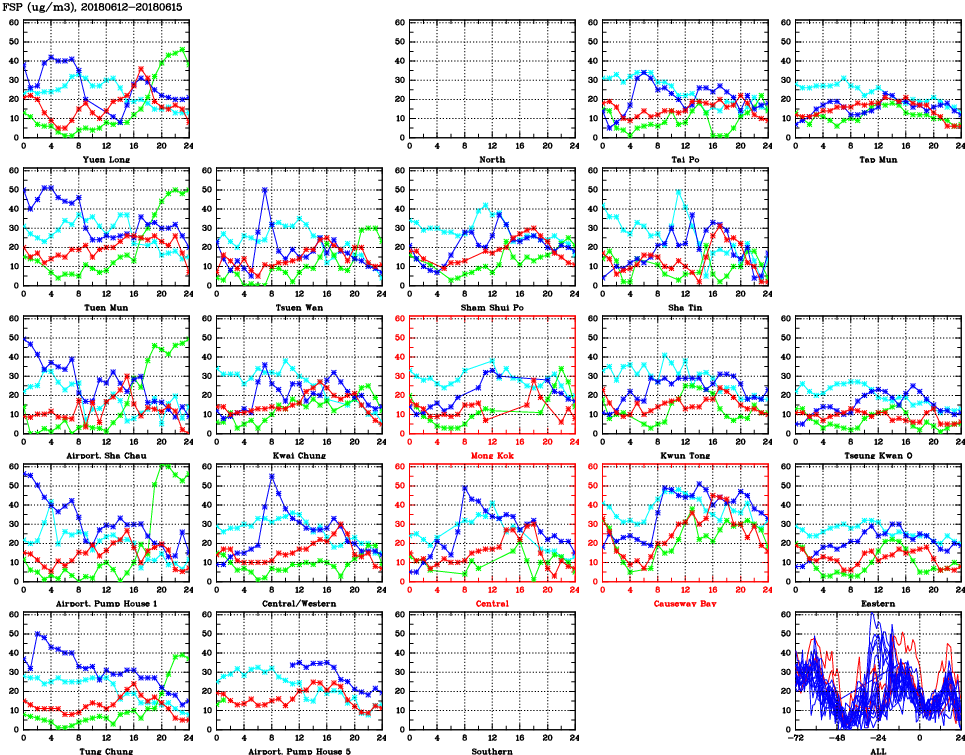 | Air Quality Data Time Series for FSP (2018/06/15) | ( Line colors: Day -3 Day -2 Day -1 Current day ) | 2D Map Current AQHI |