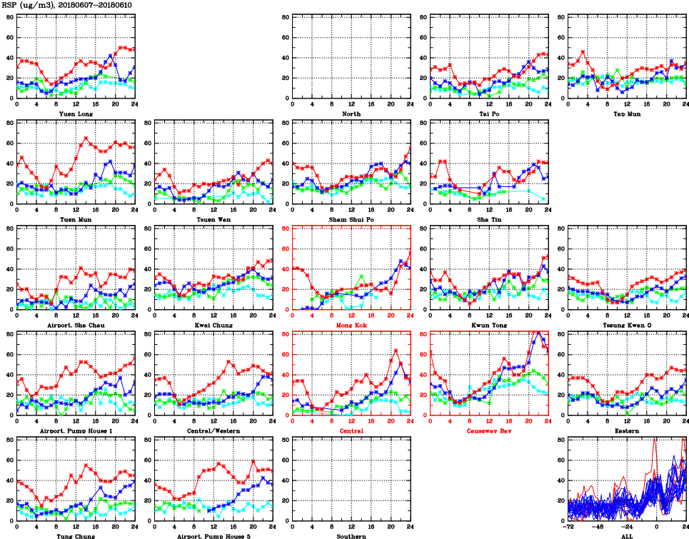 | Air Quality Data Time Series for RSP (2018/06/10) | ( Line colors: Day -3 Day -2 Day -1 Current day ) | 2D Map Current AQHI |