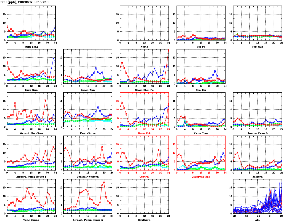 | Air Quality Data Time Series for SO2 (2018/06/10) | ( Line colors: Day -3 Day -2 Day -1 Current day ) | 2D Map Current AQHI |