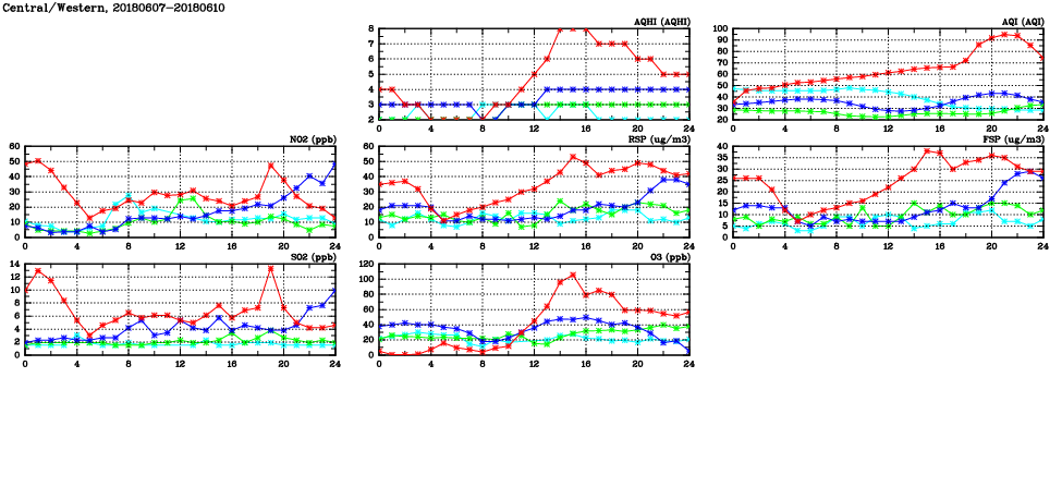 | Air Quality Data Time Series in Central/Western (2018/06/10) | ( Line colors: Day -3 Day -2 Day -1 Current day ) | 2D Map Current AQHI |