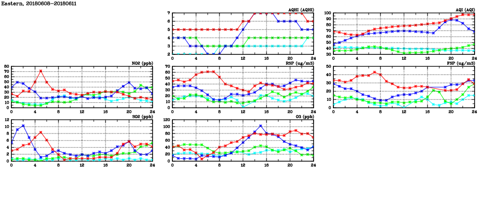 | Air Quality Data Time Series in Eastern (2018/06/11) | ( Line colors: Day -3 Day -2 Day -1 Current day ) | 2D Map Current AQHI |