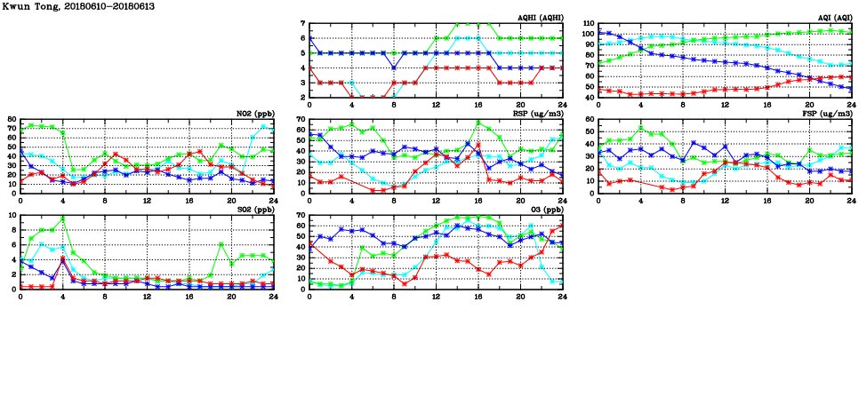 | Air Quality Data Time Series in Kwun Tong (2018/06/13) | ( Line colors: Day -3 Day -2 Day -1 Current day ) | 2D Map Current AQHI |