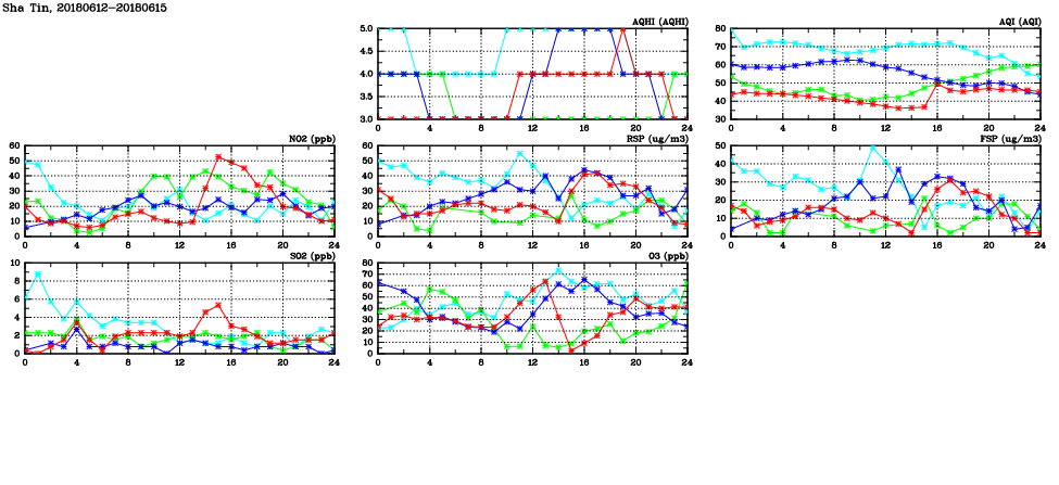| Air Quality Data Time Series in Sha Tin (2018/06/15) | ( Line colors: Day -3 Day -2 Day -1 Current day ) | 2D Map Current AQHI |