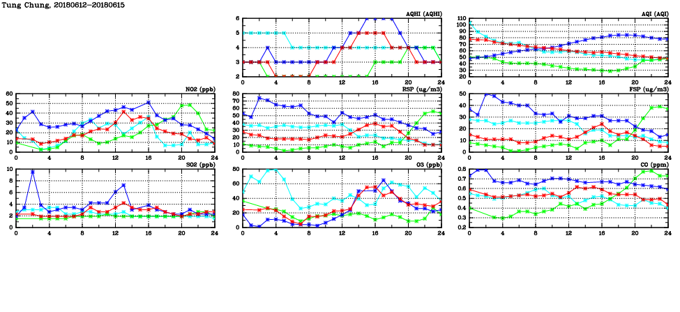 | Air Quality Data Time Series in Tung Chung (2018/06/15) | ( Line colors: Day -3 Day -2 Day -1 Current day ) | 2D Map Current AQHI |