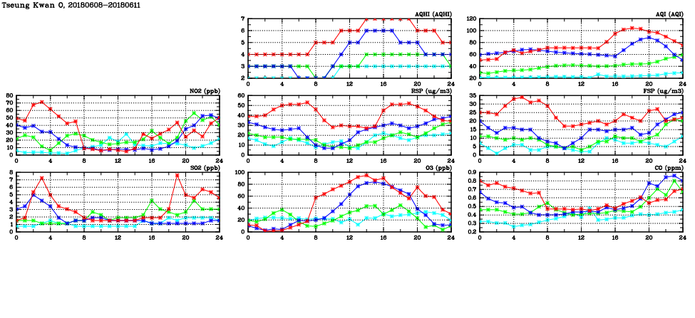 | Air Quality Data Time Series in Tseung Kwan O (2018/06/11) | ( Line colors: Day -3 Day -2 Day -1 Current day ) | 2D Map Current AQHI |