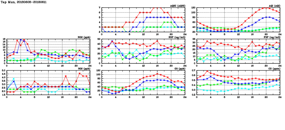 | Air Quality Data Time Series in Tap Mun (2018/06/11) | ( Line colors: Day -3 Day -2 Day -1 Current day ) | 2D Map Current AQHI |