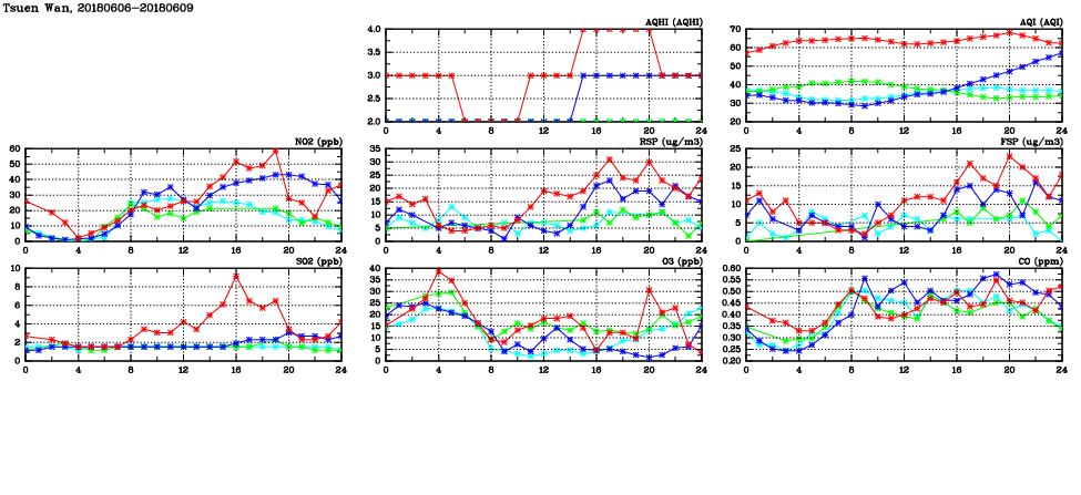 | Air Quality Data Time Series in Tsuen Wan (2018/06/09) | ( Line colors: Day -3 Day -2 Day -1 Current day ) | 2D Map Current AQHI |