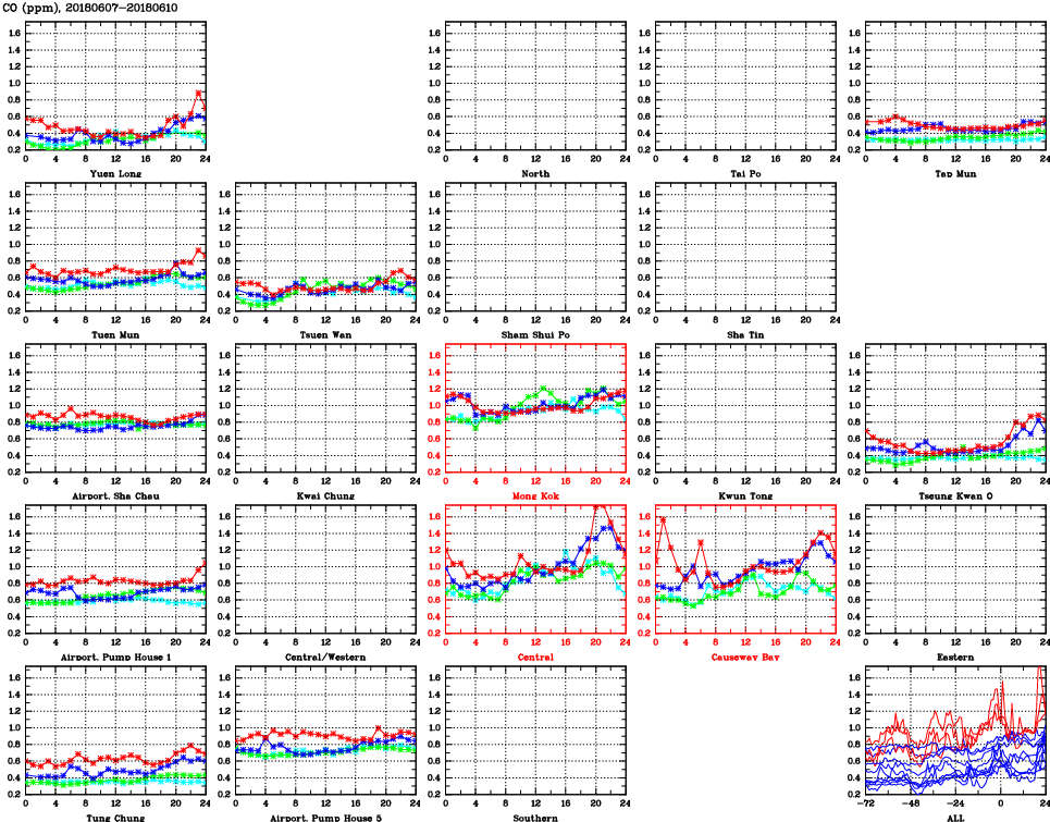 | Air Quality Data Time Series for CO (2018/06/10) | ( Line colors: Day -3 Day -2 Day -1 Current day ) | 2D Map Current AQHI |
