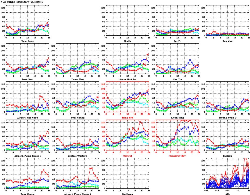 | Air Quality Data Time Series for NO2 (2018/06/10) | ( Line colors: Day -3 Day -2 Day -1 Current day ) | 2D Map Current AQHI |