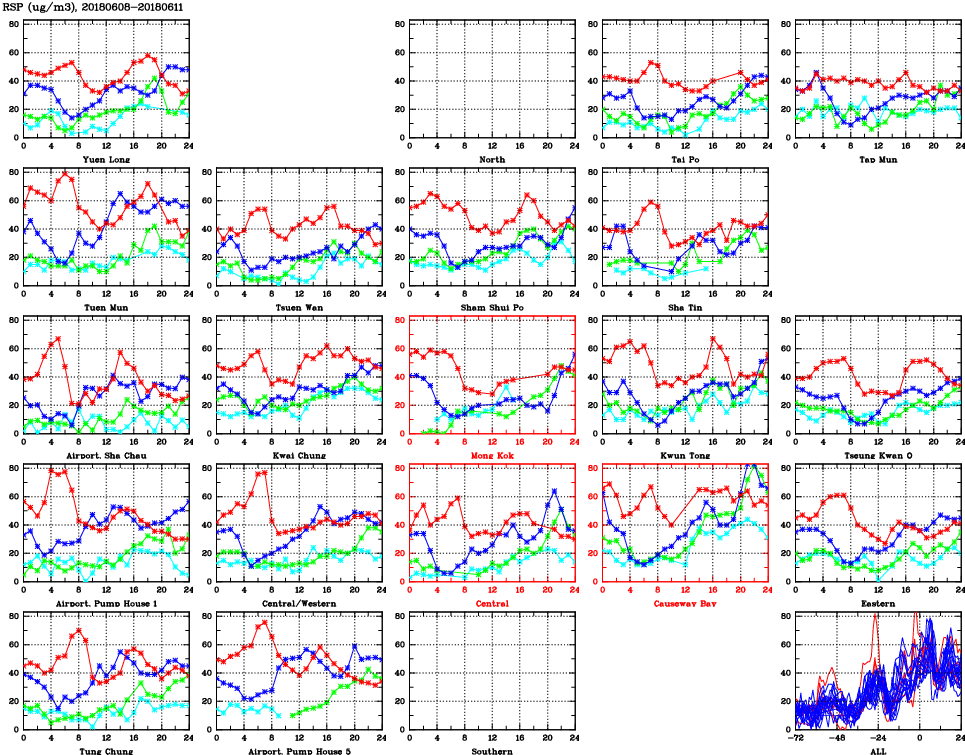 | Air Quality Data Time Series for RSP (2018/06/11) | ( Line colors: Day -3 Day -2 Day -1 Current day ) | 2D Map Current AQHI |