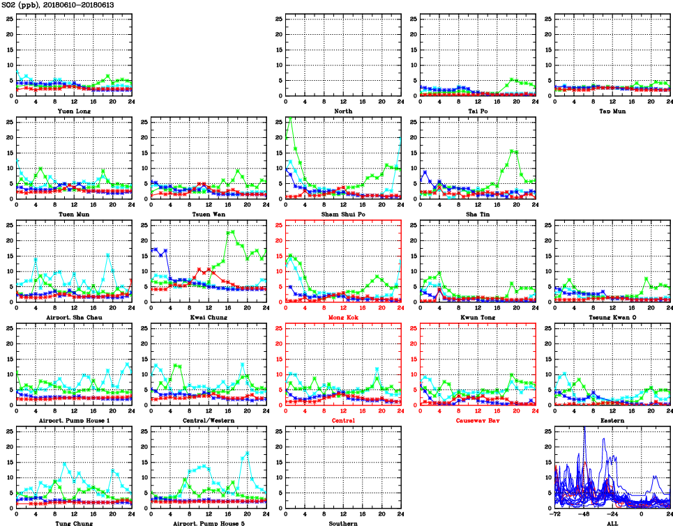 | Air Quality Data Time Series for SO2 (2018/06/13) | ( Line colors: Day -3 Day -2 Day -1 Current day ) | 2D Map Current AQHI |