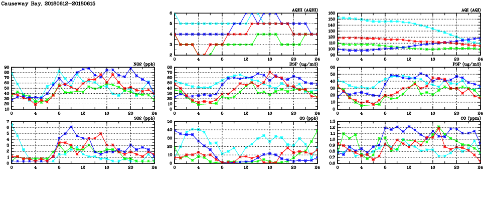 | Air Quality Data Time Series in Causeway Bay (2018/06/15) | ( Line colors: Day -3 Day -2 Day -1 Current day ) | 2D Map Current AQHI |