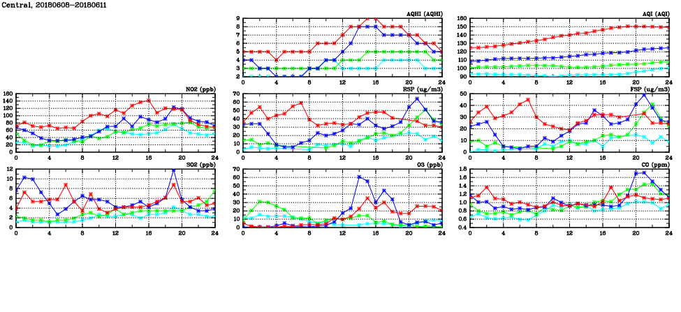 | Air Quality Data Time Series in Central (2018/06/11) | ( Line colors: Day -3 Day -2 Day -1 Current day ) | 2D Map Current AQHI |