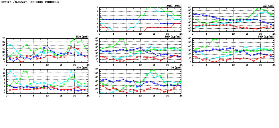 | Air Quality Data Time Series in Central/Western (2018/06/13) | ( Line colors: Day -3 Day -2 Day -1 Current day ) | 2D Map Current AQHI |