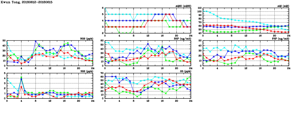 | Air Quality Data Time Series in Kwun Tong (2018/06/15) | ( Line colors: Day -3 Day -2 Day -1 Current day ) | 2D Map Current AQHI |