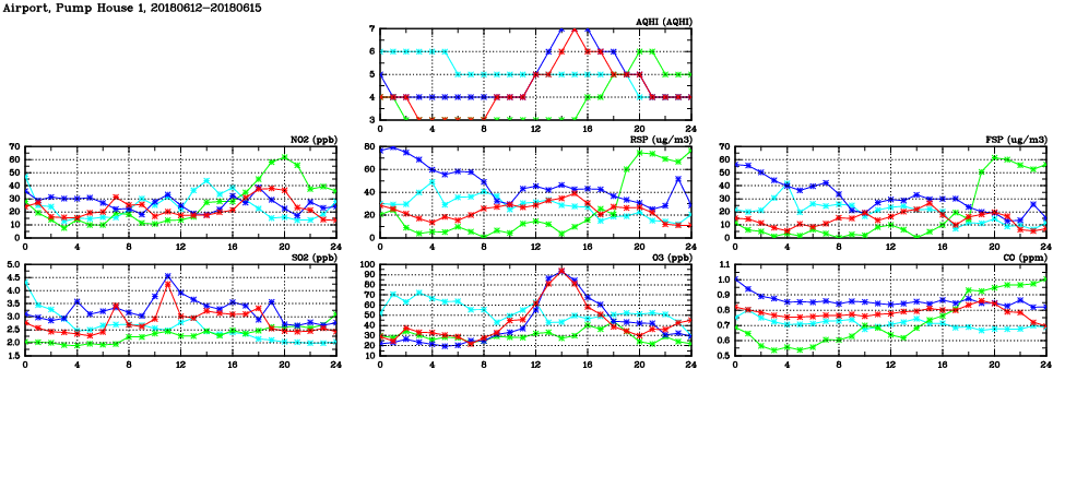 | Air Quality Data Time Series in Airport, Pump House 1 (2018/06/15) | ( Line colors: Day -3 Day -2 Day -1 Current day ) | 2D Map Current AQHI |