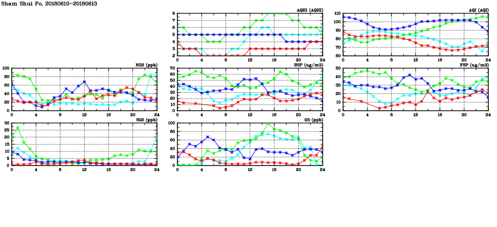 | Air Quality Data Time Series in Sham Shui Po (2018/06/13) | ( Line colors: Day -3 Day -2 Day -1 Current day ) | 2D Map Current AQHI |