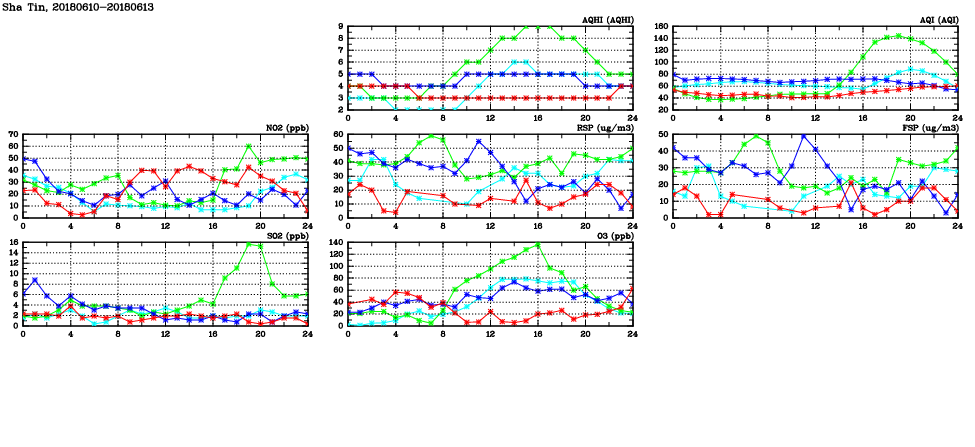| Air Quality Data Time Series in Sha Tin (2018/06/13) | ( Line colors: Day -3 Day -2 Day -1 Current day ) | 2D Map Current AQHI |