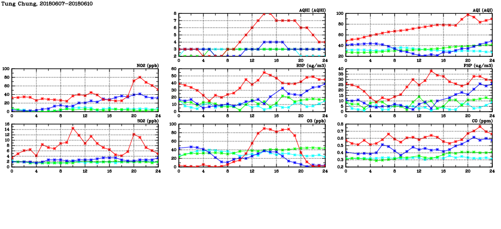 | Air Quality Data Time Series in Tung Chung (2018/06/10) | ( Line colors: Day -3 Day -2 Day -1 Current day ) | 2D Map Current AQHI |