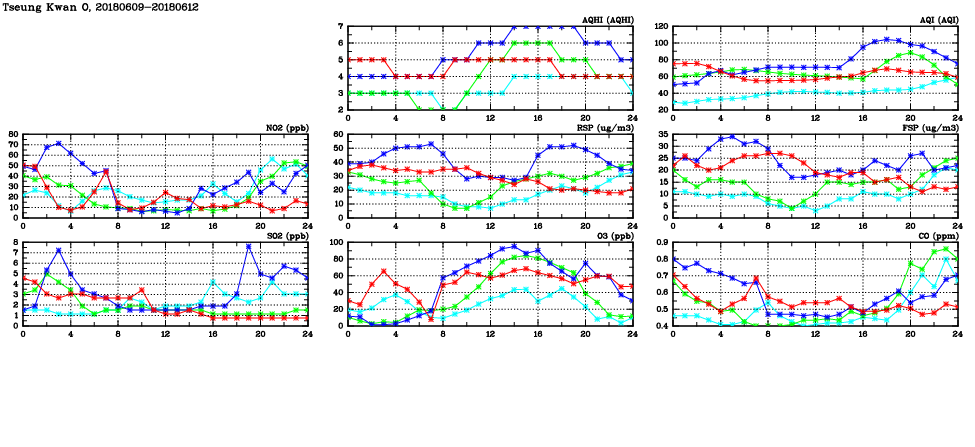 | Air Quality Data Time Series in Tseung Kwan O (2018/06/12) | ( Line colors: Day -3 Day -2 Day -1 Current day ) | 2D Map Current AQHI |
