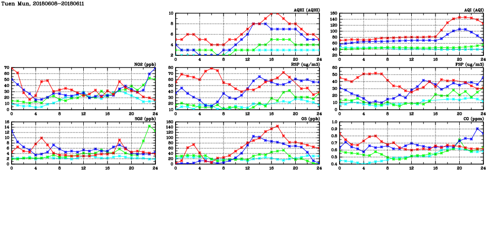 | Air Quality Data Time Series in Tuen Mun (2018/06/11) | ( Line colors: Day -3 Day -2 Day -1 Current day ) | 2D Map Current AQHI |
