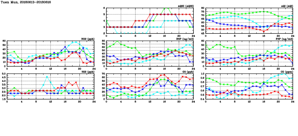 | Air Quality Data Time Series in Tuen Mun (2018/06/16) | ( Line colors: Day -3 Day -2 Day -1 Current day ) | 2D Map Current AQHI |