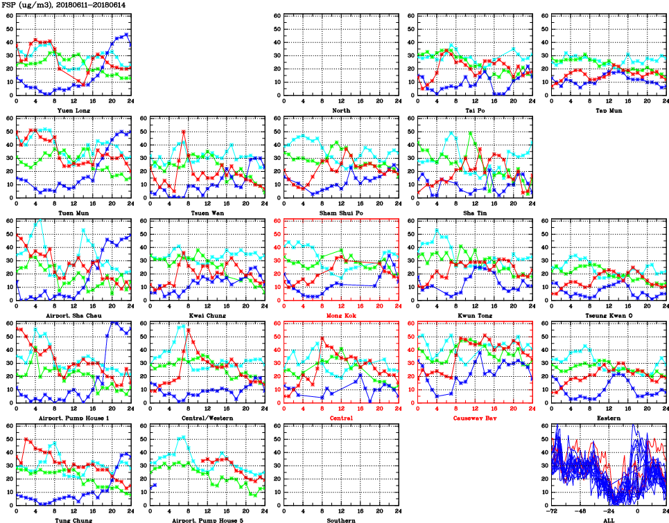 | Air Quality Data Time Series for FSP (2018/06/14) | ( Line colors: Day -3 Day -2 Day -1 Current day ) | 2D Map Current AQHI |