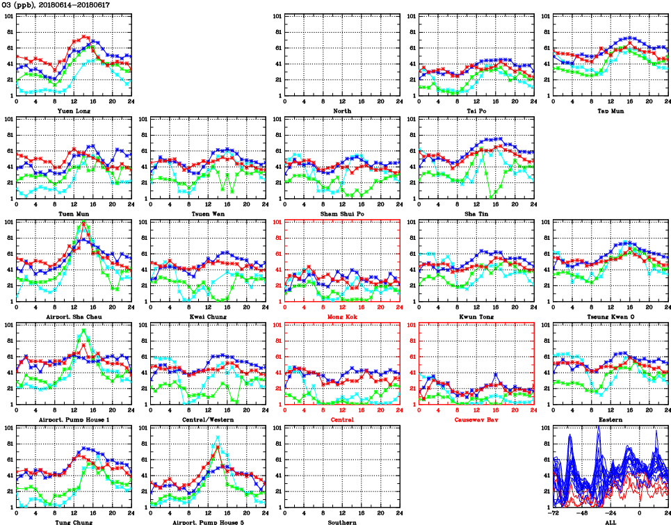 | Air Quality Data Time Series for O3 (2018/06/17) | ( Line colors: Day -3 Day -2 Day -1 Current day ) | 2D Map Current AQHI |