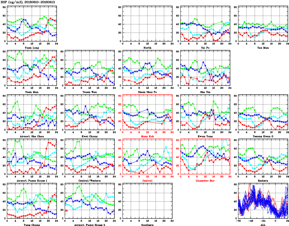 | Air Quality Data Time Series for RSP (2018/06/13) | ( Line colors: Day -3 Day -2 Day -1 Current day ) | 2D Map Current AQHI |