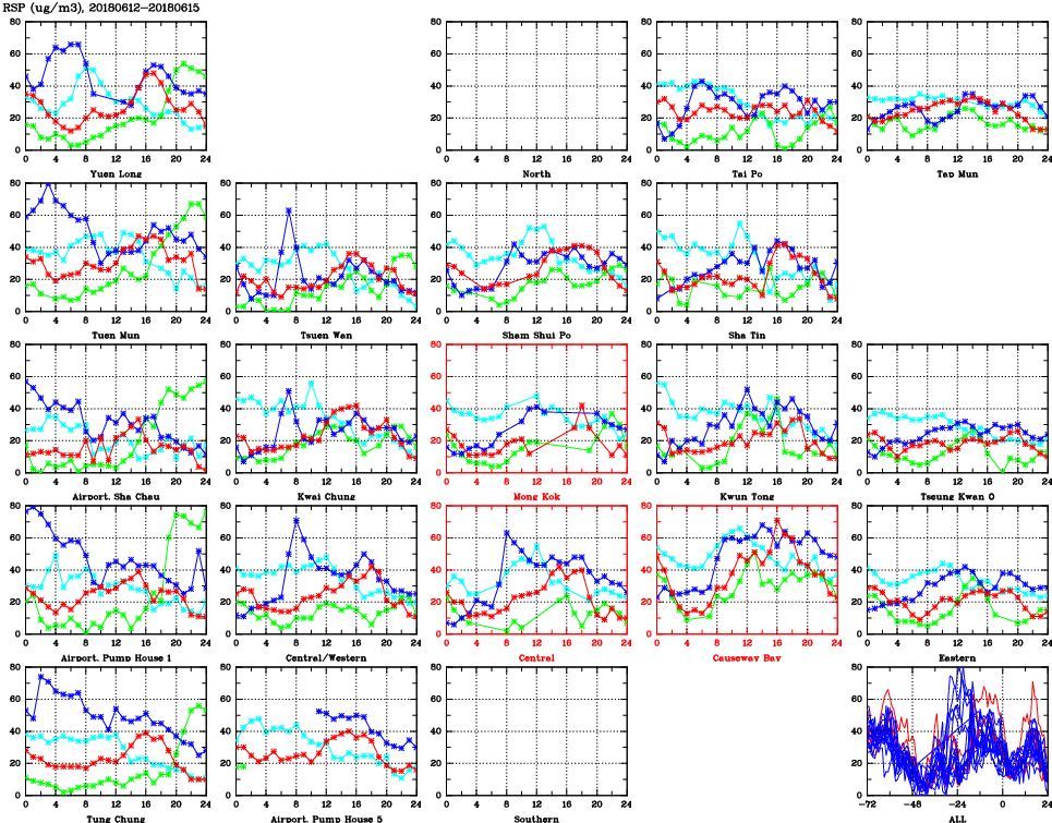 | Air Quality Data Time Series for RSP (2018/06/15) | ( Line colors: Day -3 Day -2 Day -1 Current day ) | 2D Map Current AQHI |