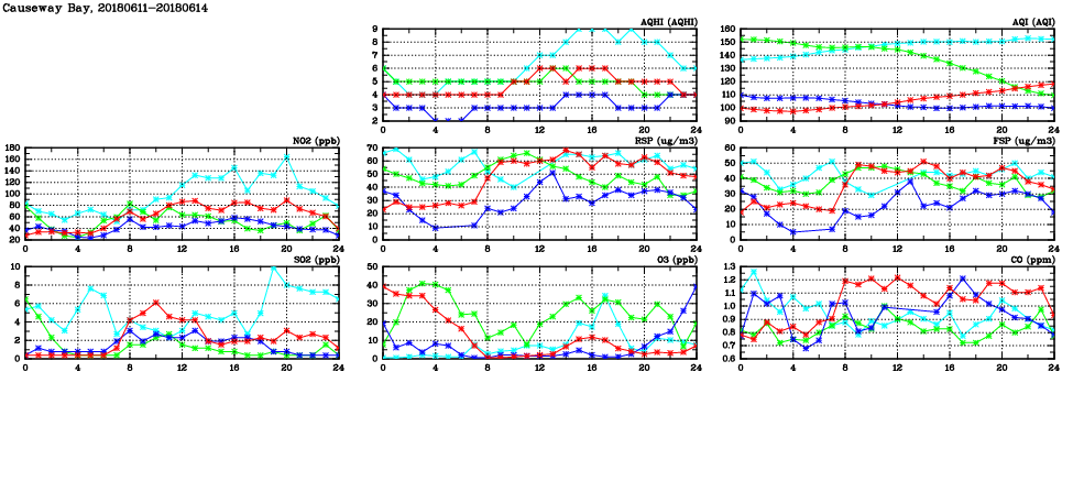 | Air Quality Data Time Series in Causeway Bay (2018/06/14) | ( Line colors: Day -3 Day -2 Day -1 Current day ) | 2D Map Current AQHI |