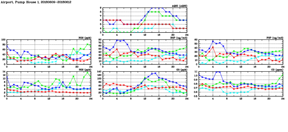 Air Quality Data Time Series in Airport, Pump House 1 (2018/06/12) ( Line colors: Day -3 Day -2 Day -1 Current day ) 2D Map   Current AQHI