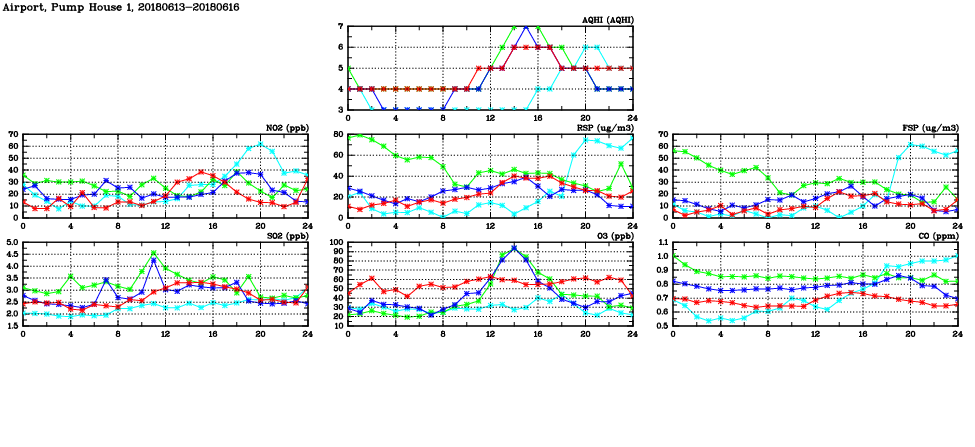 | Air Quality Data Time Series in Airport, Pump House 1 (2018/06/16) | ( Line colors: Day -3 Day -2 Day -1 Current day ) | 2D Map Current AQHI |