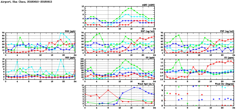 | Air Quality Data Time Series in Airport, Sha Chau (2018/06/13) | ( Line colors: Day -3 Day -2 Day -1 Current day ) | 2D Map Current AQHI |