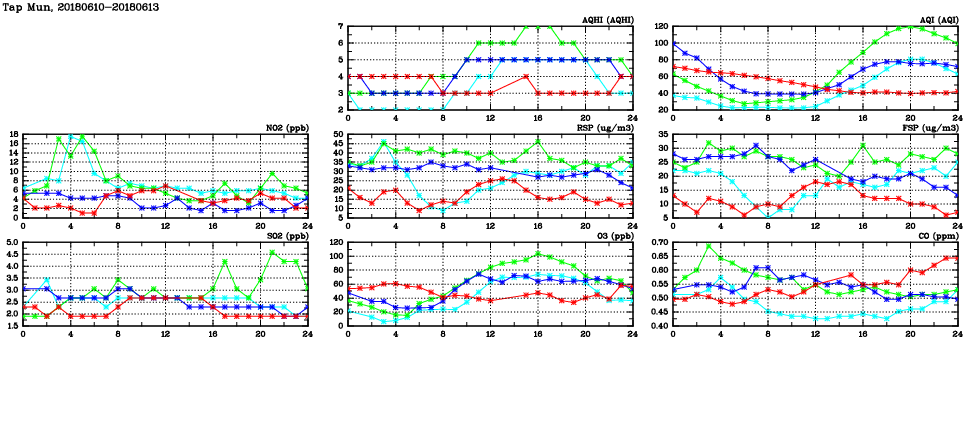 | Air Quality Data Time Series in Tap Mun (2018/06/13) | ( Line colors: Day -3 Day -2 Day -1 Current day ) | 2D Map Current AQHI |