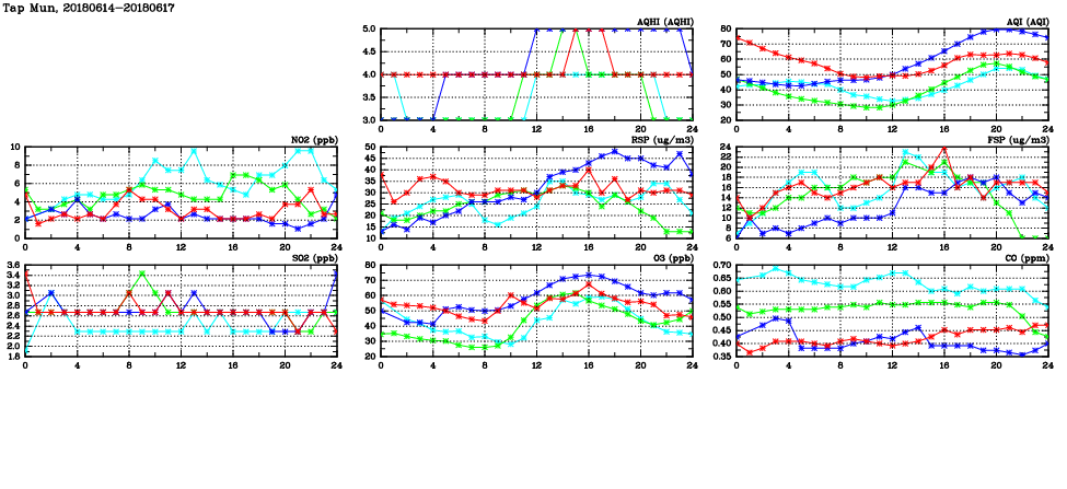 | Air Quality Data Time Series in Tap Mun (2018/06/17) | ( Line colors: Day -3 Day -2 Day -1 Current day ) | 2D Map Current AQHI |