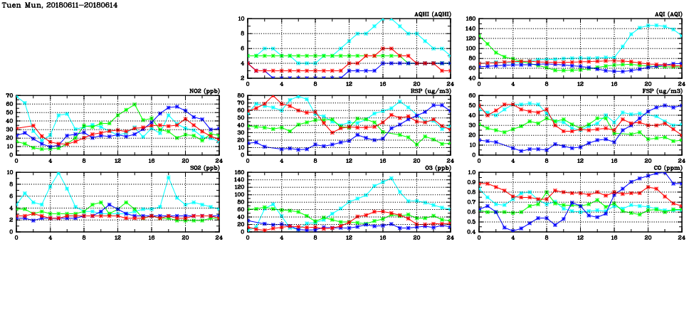 | Air Quality Data Time Series in Tuen Mun (2018/06/14) | ( Line colors: Day -3 Day -2 Day -1 Current day ) | 2D Map Current AQHI |
