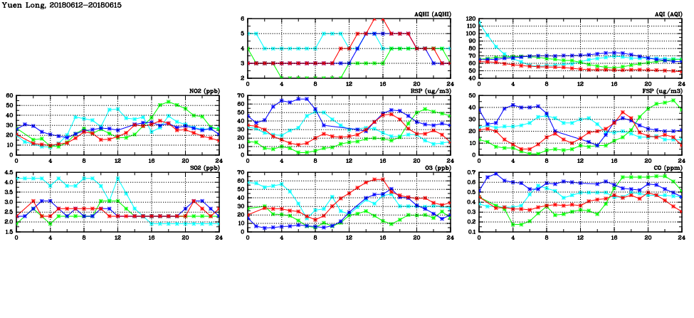 | Air Quality Data Time Series in Yuen Long (2018/06/15) | ( Line colors: Day -3 Day -2 Day -1 Current day ) | 2D Map Current AQHI |