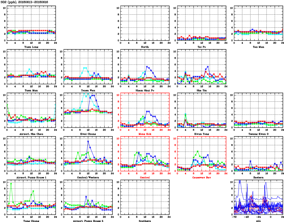 | Air Quality Data Time Series for SO2 (2018/06/16) | ( Line colors: Day -3 Day -2 Day -1 Current day ) | 2D Map Current AQHI |