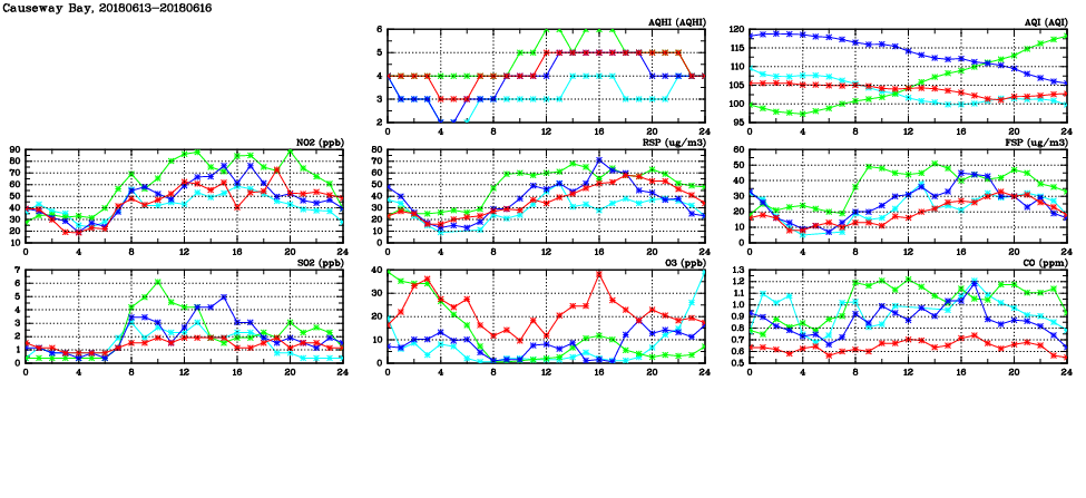 | Air Quality Data Time Series in Causeway Bay (2018/06/16) | ( Line colors: Day -3 Day -2 Day -1 Current day ) | 2D Map Current AQHI |