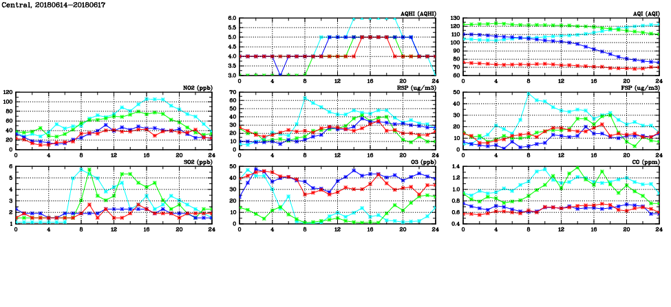 | Air Quality Data Time Series in Central (2018/06/17) | ( Line colors: Day -3 Day -2 Day -1 Current day ) | 2D Map Current AQHI |