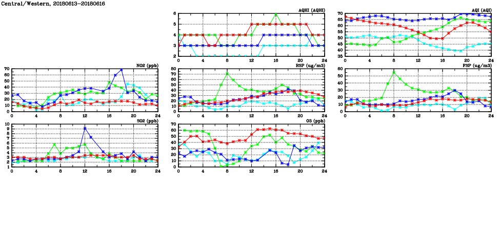 | Air Quality Data Time Series in Central/Western (2018/06/16) | ( Line colors: Day -3 Day -2 Day -1 Current day ) | 2D Map Current AQHI |